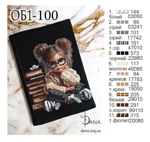“Boeken Wurm” is een charmante agenda omslag om te borduren met kralen. Het ontwerp toont een schattig kind met bril en knotjes, zittend naast een stapel boeken — perfect voor iedereen die van lezen, leren en creativiteit houdt.