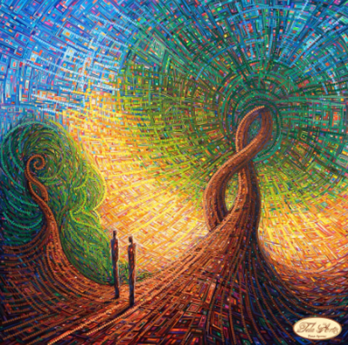 Twee figuren staan op een kronkelend pad dat zich omhoog slingert en uitmondt in twee boomachtige vormen, als wortels die tegelijk takken zijn. De achtergrond is een levendige mozaïek van kleuren: koel blauw en groen aan de ene kant, warm geel en oranje aan de andere. De wervelende patronen creëren beweging, diepte en een bijna spirituele energie. Het voelt alsof je kijkt naar een innerlijke reis, een kruispunt van verleden en toekomst.