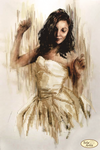 Een elegante danseres beweegt sierlijk door de ruimte, haar donkere haar golvend mee met elke beweging. Ze draagt een zachte, strapless jurk waarvan de stof in een pixelachtige structuur overgaat, alsof het ontwerp met liefde met de hand is opgebouwd. Haar armen zijn geheven in een vloeiende, bijna gewichtloze pose, terwijl de achtergrond in zachte verticale tinten een gevoel van ritme en beweging oproept. Het geheel ademt warmte, kunstzinnigheid en een vleugje dromerige nostalgie.