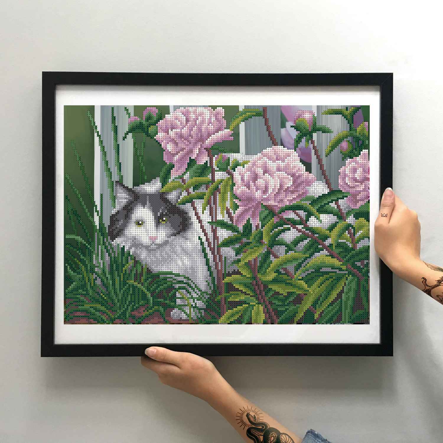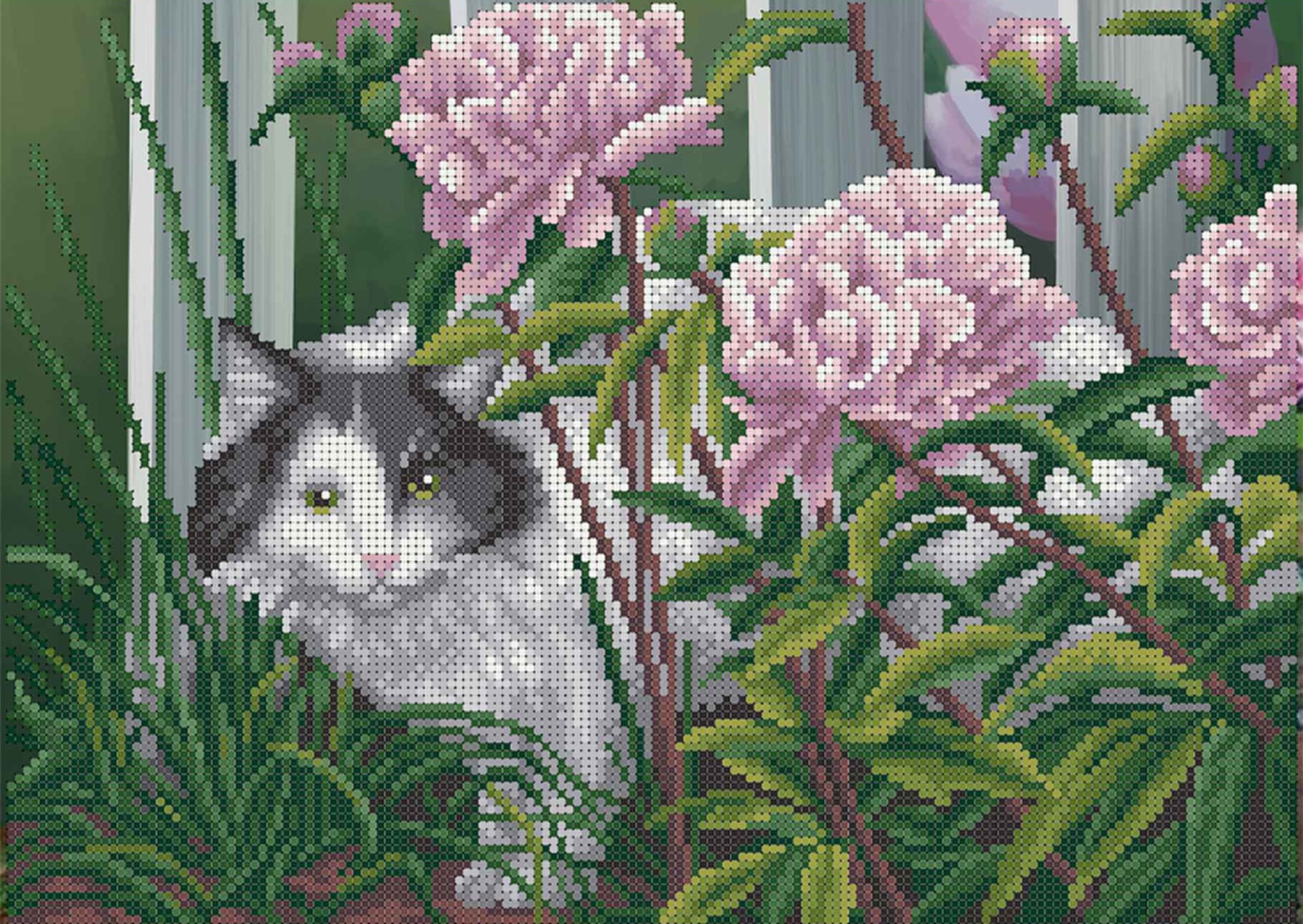 Een charmant tafereel van een wit-grijze kat tussen bloeiende pioenrozen en groen blad, met een witte railing op de achtergrond. Dit kralenborduurpakket combineert speelsheid met rust en natuurlijke schoonheid.