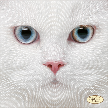 Een witte kat kijkt je aan met grote, kristalblauwe ogen die meteen het hart raken. De zachte vacht is opgebouwd uit fijne, bijna pluizige structuren die het gevoel geven dat je haar zo zou kunnen aaien. De roze neus en subtiele schaduwen brengen leven en warmte in het gezicht. Het geheel straalt rust, zachtheid en een bijna engelachtige schoonheid uit.