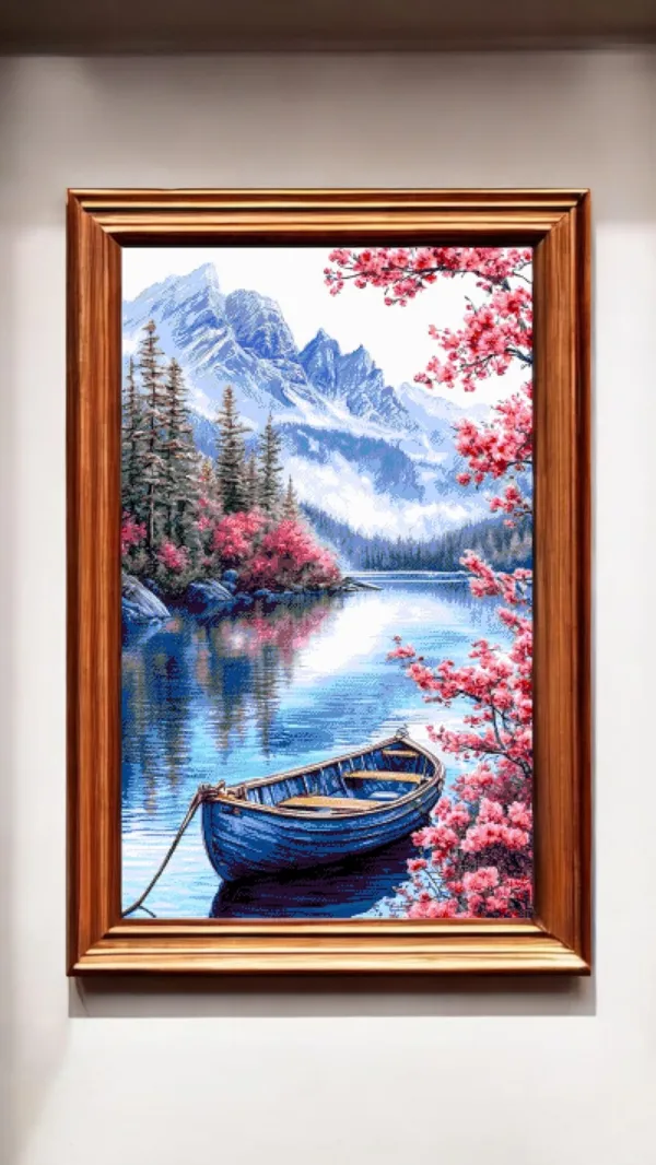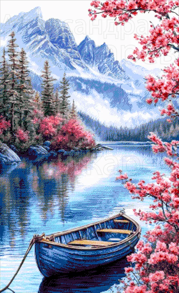 In dit ontwerp ligt een blauw houten bootje zachtjes tegen de oever van een helder meer. Het water weerspiegelt de wereld eromheen: roze bloesembomen in volle bloei, donkere dennen die statig langs de rand staan en majestueuze bergen waarvan de toppen nog met sneeuw zijn bedekt. De Preciosa‑kralen brengen elke nuance tot leven: het koele blauw van het water, het warme roze van de bloesems en het zachte licht dat over het landschap glijdt.