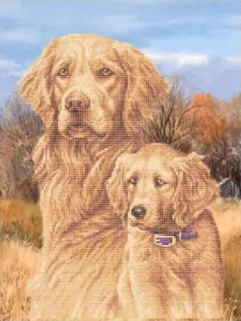 Een volwassen golden retriever zit rustig in een natuurlijk landschap, zijn zachte blik vol wijsheid en vertrouwen. Naast hem zit een jonge pup, nog klein en nieuwsgierig, met een speelse houding en een warme, open uitstraling. De twee honden vormen samen een liefdevol duo, omringd door hoge grassen en een stille, heldere lucht. De pixelachtige structuur geeft het geheel een handgemaakte, tedere charme, alsof elke vachtlok en elke grasspriet met zorg is opgebouwd.