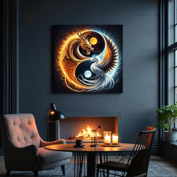 De draak en de feniks zijn in veel culturen een symbool van harmonie tussen tegenpolen. De draak staat voor kracht, vuur, bescherming en mannelijke energie. De feniks belichaamt vernieuwing, intuïtie, lucht en vrouwelijke energie. Samen vormen ze een evenwicht dat niet statisch is, maar voortdurend in beweging — precies zoals het leven zelf.