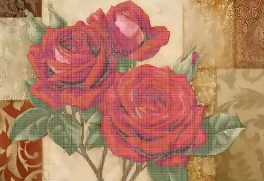 Op een warme patchwork‑achtige achtergrond ontvouwen drie dieprode rozen hun fluwelen blaadjes. De zachte patronen in goud‑ en beigetinten geven het geheel een klassieke, bijna nostalgische uitstraling. De rozen lijken haast te ademen, met subtiele schaduwen en rijke kleurovergangen die het tafereel diepte en rust geven.