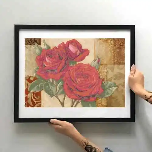 Dit ontwerp past prachtig in een woonkamer, slaapkamer of creatieve ruimte waar warmte en elegantie centraal staan. De combinatie van diepe roodtinten en zachte achtergrondkleuren brengt een harmonieuze, uitnodigende sfeer die moeiteloos in zowel moderne als klassieke interieurs tot zijn recht komt.