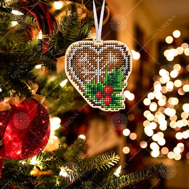Het hartje is uitgevoerd in warme bruintinten, met een sierlijk wit patroon dat doet denken aan een sneeuwster of winterbloem. Onderaan zorgen groene takjes en rode accenten voor een frisse, feestelijke toets. De kralen geven het geheel een sprankelende textuur, alsof het hartje een zachte lichtval vangt. Het houten silhouet is zorgvuldig uitgesneden en voorzien van een elegant lint, klaar om op te hangen waar het het mooist tot zijn recht komt.