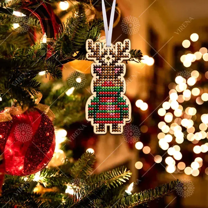 Het hert straalt met zijn zachte bruine tinten, sierlijke gewei en lieve blik. De kleurrijke kersttrui in rood‑ en groentinten geeft hem een speelse, feestelijke uitstraling. De kralen zorgen voor een sprankelende textuur, alsof het hert net een lichtstraal opvangt tijdens een winterwandeling. Het houten silhouet is zorgvuldig uitgesneden en voorzien van een elegant lint, klaar om een mooi plekje te krijgen in de kerstboom of aan een decoratieve haak.
