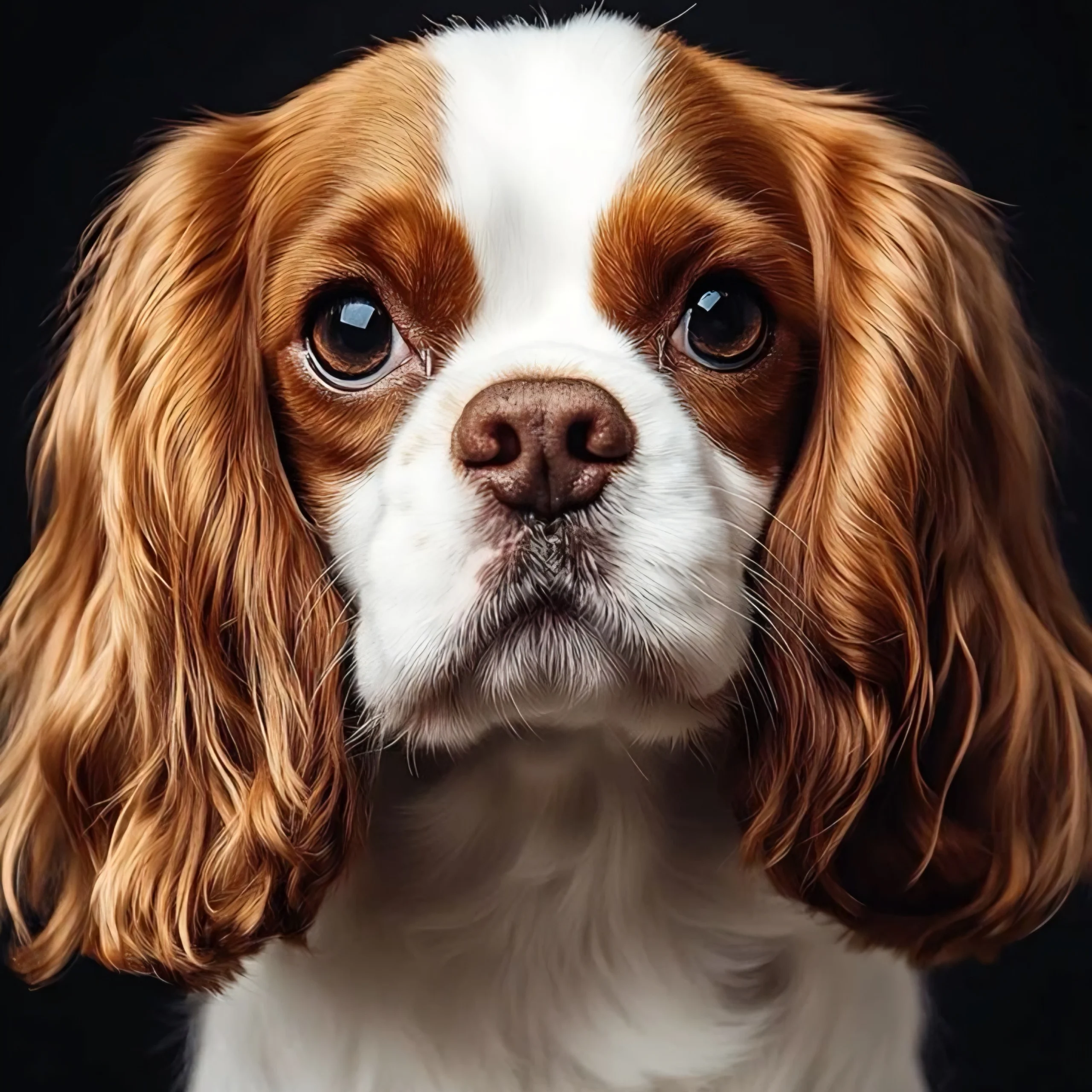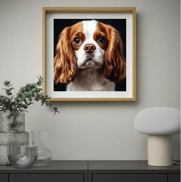 De compositie is intiem en hartverwarmend. De donkere achtergrond laat zijn zachte blik nog meer spreken, alsof hij net naar je toe komt voor een knuffel. Het geheel ademt zachtheid, trouw en een bijna koninklijke charme — precies wat deze honden zo geliefd maakt.