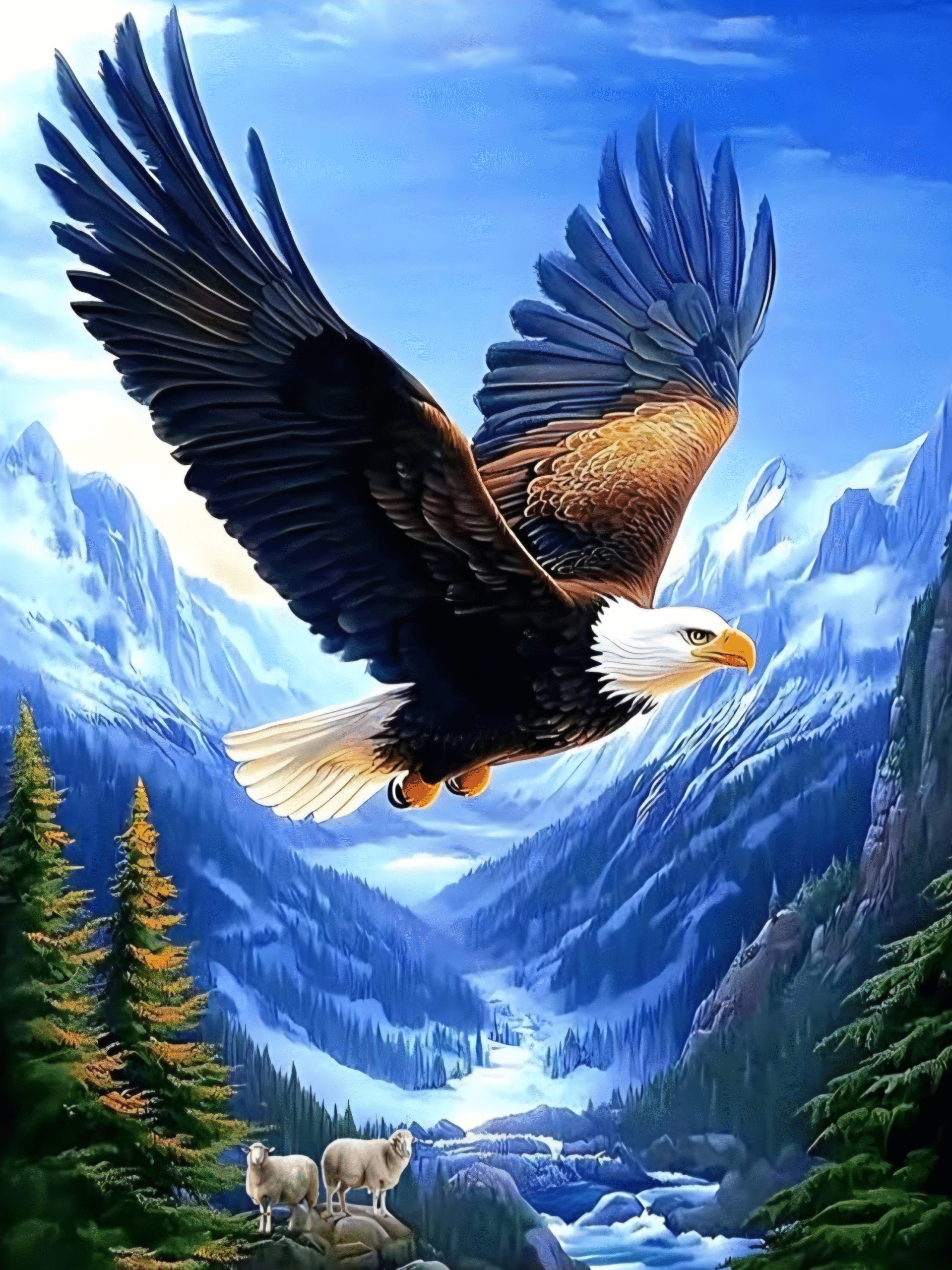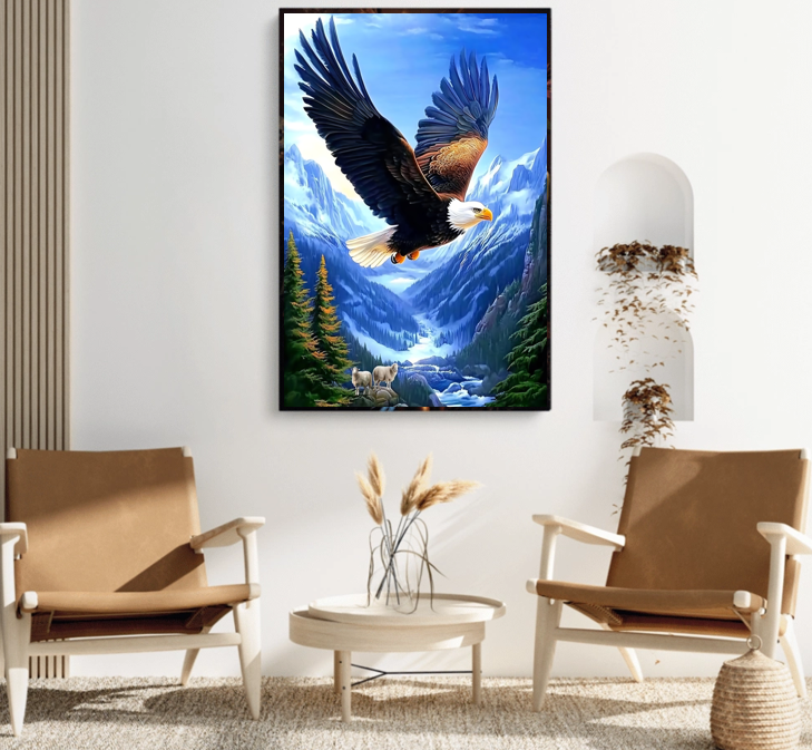 Een adelaar zweeft hoog boven een berglandschap, zijn vleugels wijd uitgespreid, zijn blik scherp en vrij. Dit indrukwekkende ontwerp vangt het moment waarop natuur en kracht samenkomen: besneeuwde toppen, diepe valleien en een adelaar die de lucht beheerst.
