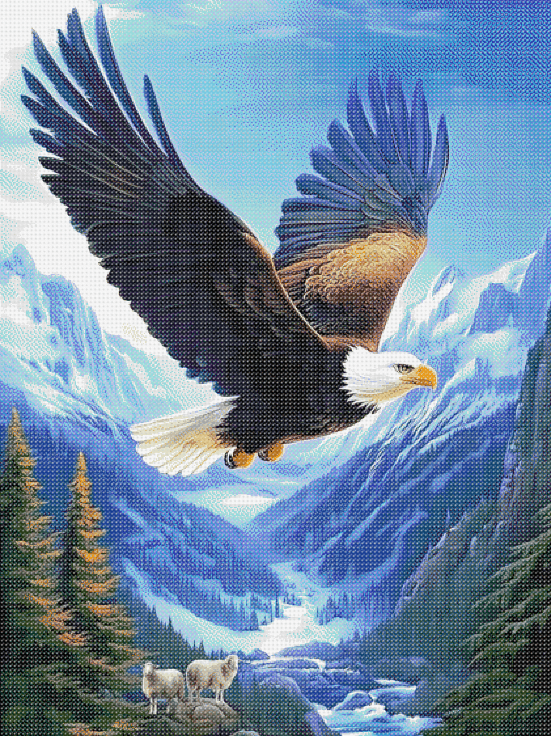 Op wit Aida canvas borduur je dit tafereel met originele Preciosa Ornella kralen in rijke aardetinten, koel blauw en helder wit. Elk detail — van de veren tot de bergtoppen en de geiten op de rotsen — is zorgvuldig vertaald voor een realistisch en dynamisch eindresultaat.