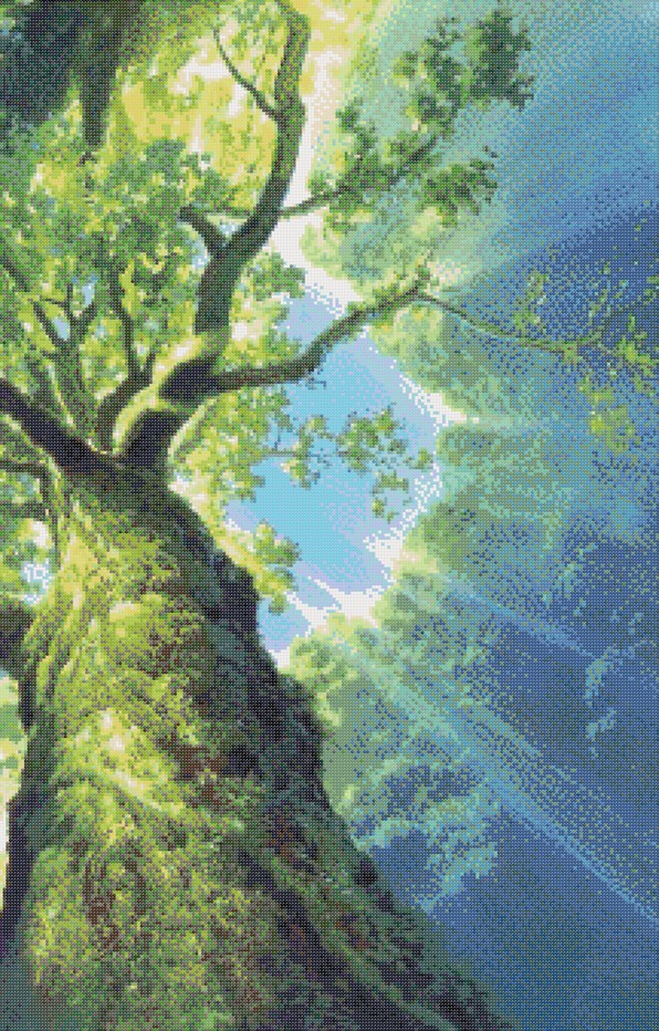 Dit ontwerp vangt het moment waarop de natuur haar adem inhoudt. Een monumentale boom rijst op vanuit het hart van het bos, zijn stam bedekt met mos, zijn bladerdak badend in zonlicht. De blik omhoog onthult een spel van licht en schaduw, een stille viering van leven, groei en tijdloze schoonheid.