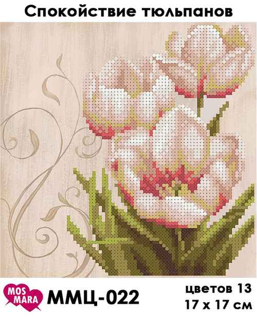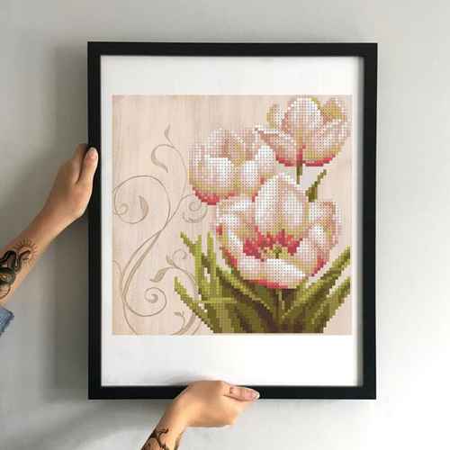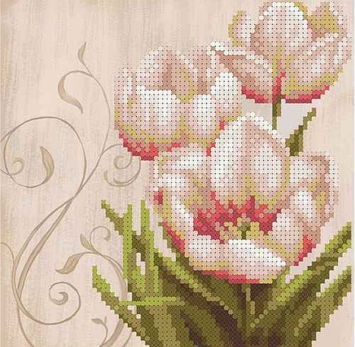 Roze en witte tulpen met frisgroene bladeren vormen een elegant boeket tegen een licht beige achtergrond met sierlijke krullen. De pixelachtige borduurstijl geeft het geheel een verfijnde, handgemaakte uitstraling vol detail en rust. De compositie straalt balans en tederheid uit.